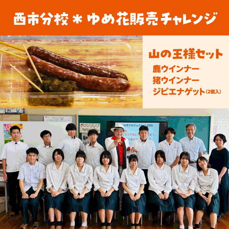 山口農業高校西市分校の生徒たちが、地域資源「ジビエ」を活かした特製セットを販売します。鹿ウインナー・猪ウインナー・ジビエナゲット(2個入り)を組み合わせた、食べやすく楽しいメニューです。